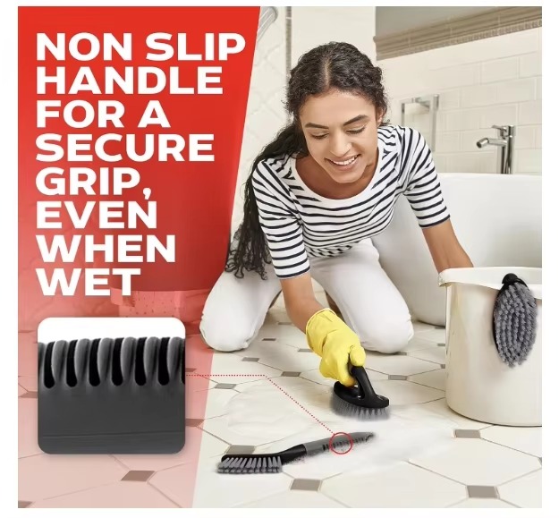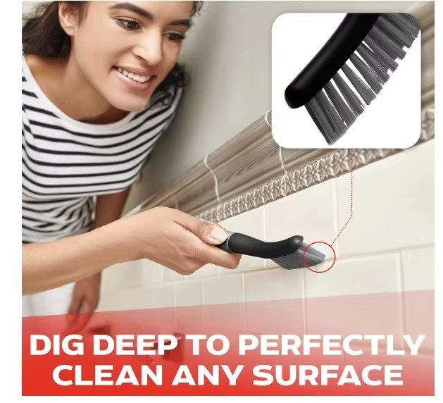 Uniquely shaped bristles of thi brush makes cleaning grout and corners fast and easy. Tough bristles scrub away grime and soap scum.
