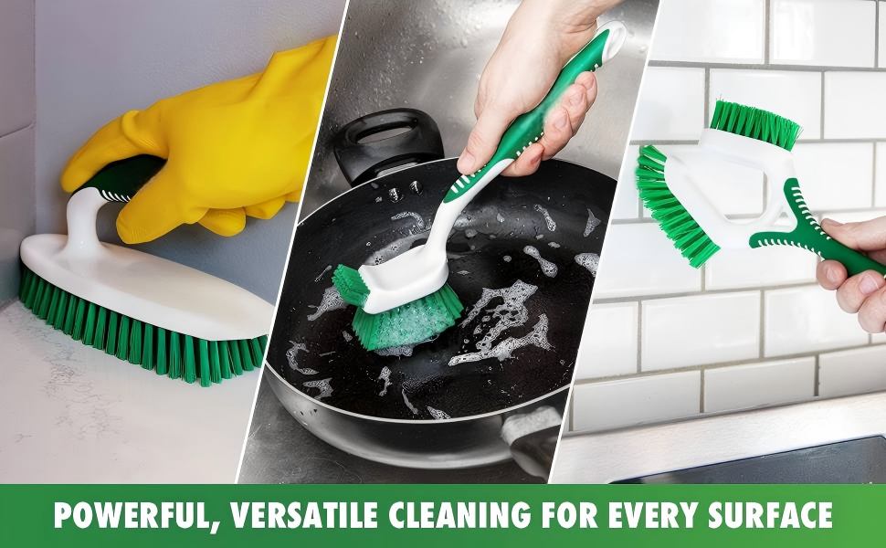 12"HEAVY-DUTY SCRUB BRUSHES FOR CLEANING: Tackle every mess with the Heavy Duty Scrub Brush Kit; Includes 3 specialized household cleaning brushes; Easy-Grip Scrub Brush, Big Job Kitchen Brush, and FiberForce Tile and Grout Brush