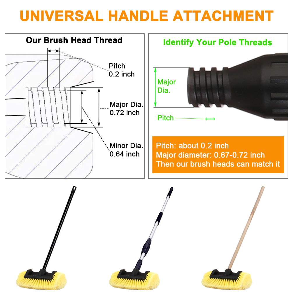 This car washing brush head can fit most standard parallel male threaded broom handles or extension brush poles. Pls make sure the major diameter is between 0.67-0.72 inches and the pitch is about 0.2 inches, or our brush heads can not match your poleThis bi-level brush can also be used for auto car rv suv truck camper boat exterior washing and cleaning"