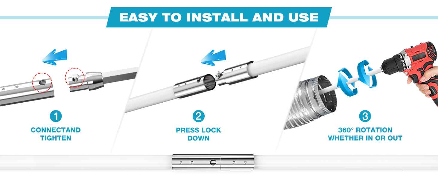 The quick snap rods are upgraded to assemble faster and NO need to concern rods coming apart whether turning clockwise or counterclockwise. The dryer vent cleaning equipment with auger brush works well with cordless drill, enable to finish dryer cleaning thoroughly and omnidirectional