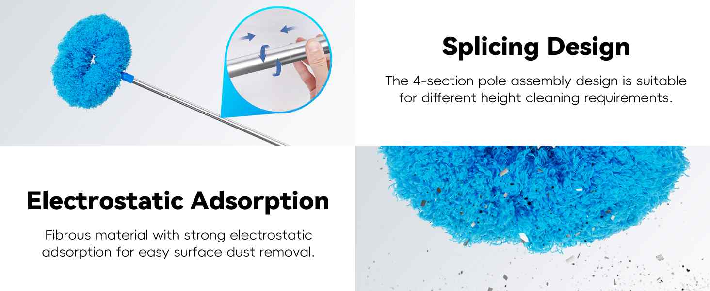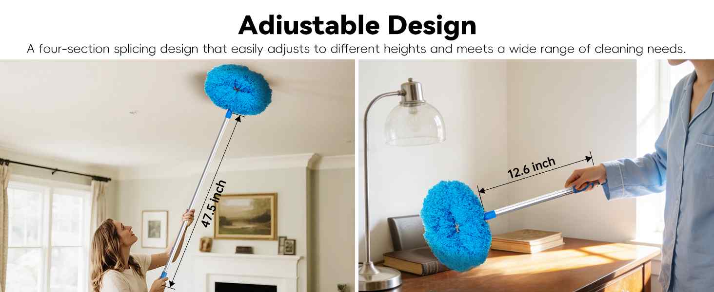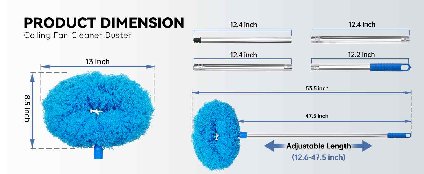 [Adjustable Length] The ceiling fan cleaner is a four segment splicing product that can be freely adjusted in length. The extension pole can be adjusted to 13 to 48 inches, making it convenient to clean both low areas and high ceilings.