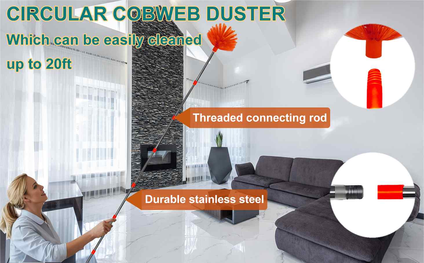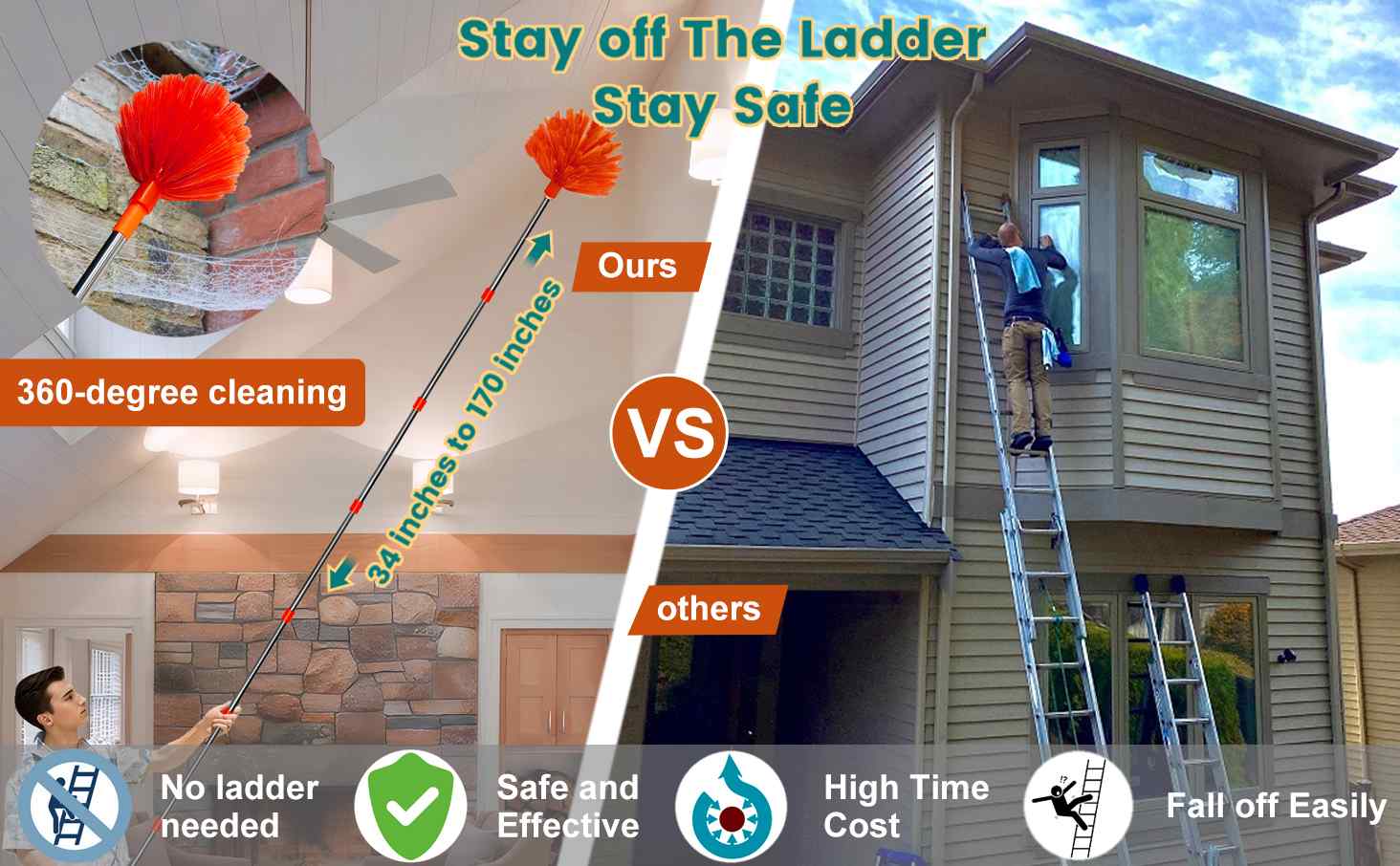 Threaded Pole Connection: our duster has an extra long extendable pole from 34 inches to 170 inches/14feet (Not included the height of duster head and human), According to the length you need, they can help you safe clean everywhere you want, avoid ladder to climb anymore.which can be easily cleaned regardless of height(The cleaning height can reach 20 feet).