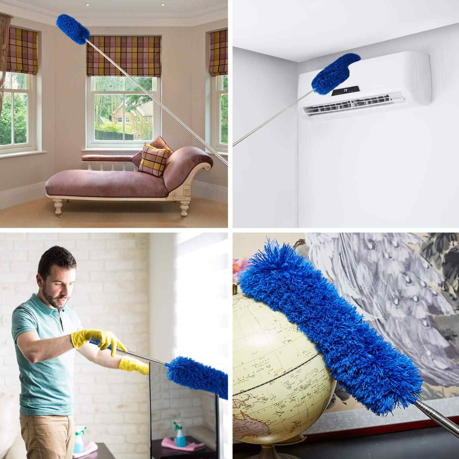 Flexible Design for Hard-to-Reach Areas: The long microfiber duster is equipped with a built-in, bendable metal rod, allowing you to adjust its shape to clean hard-to-see areas, such as the top of desks or the back of ceiling fans. Its microfiber material carries a slight positive charge, which allows it to easily grab and capture hair and dust