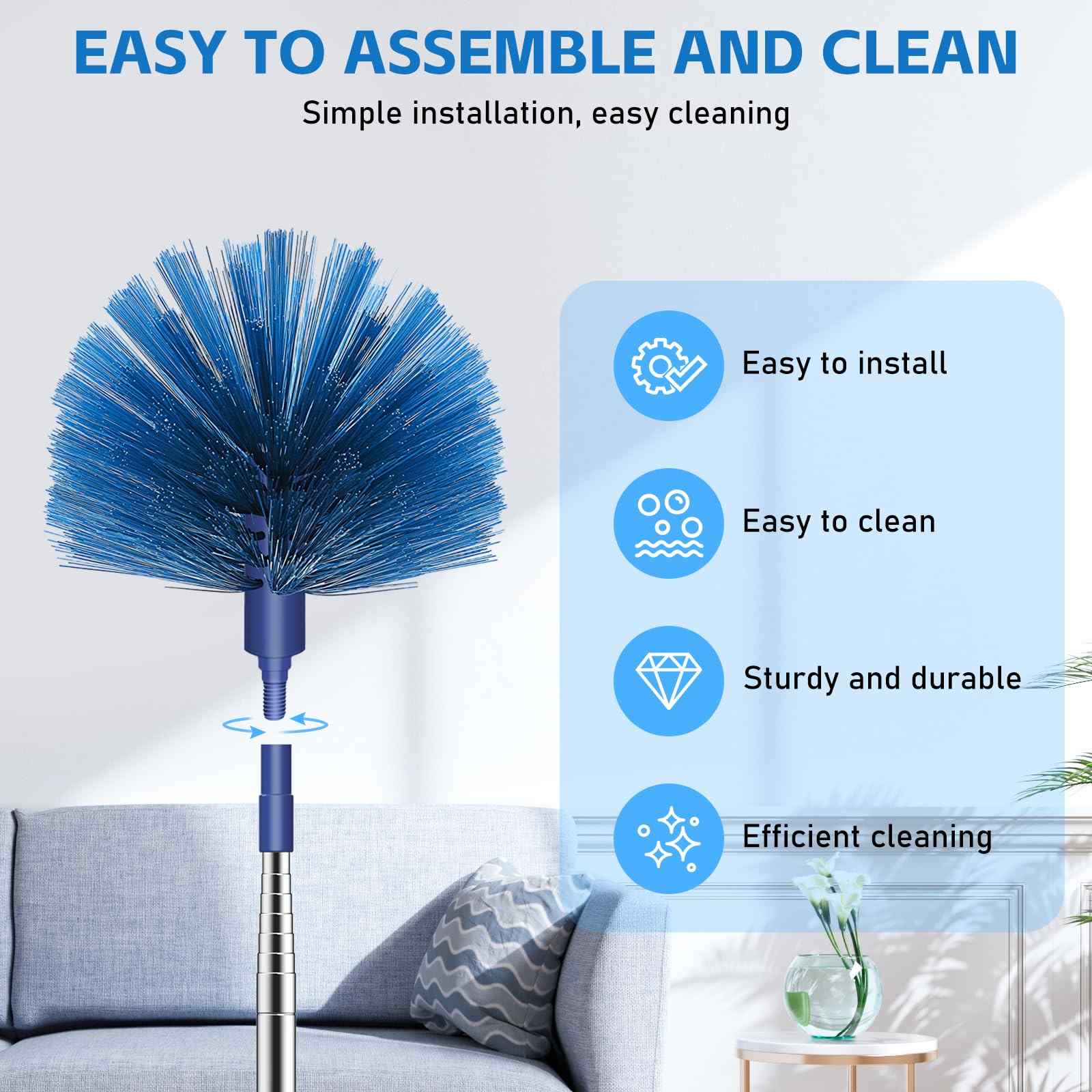 EASY TO ASSEMBLE AND CLEAN - This spider web brush is easy to install. Just connect the telescopic rod and the spider web brush head through a threaded link. After use, it can be directly rinsed with clean water and is easy to clean.
