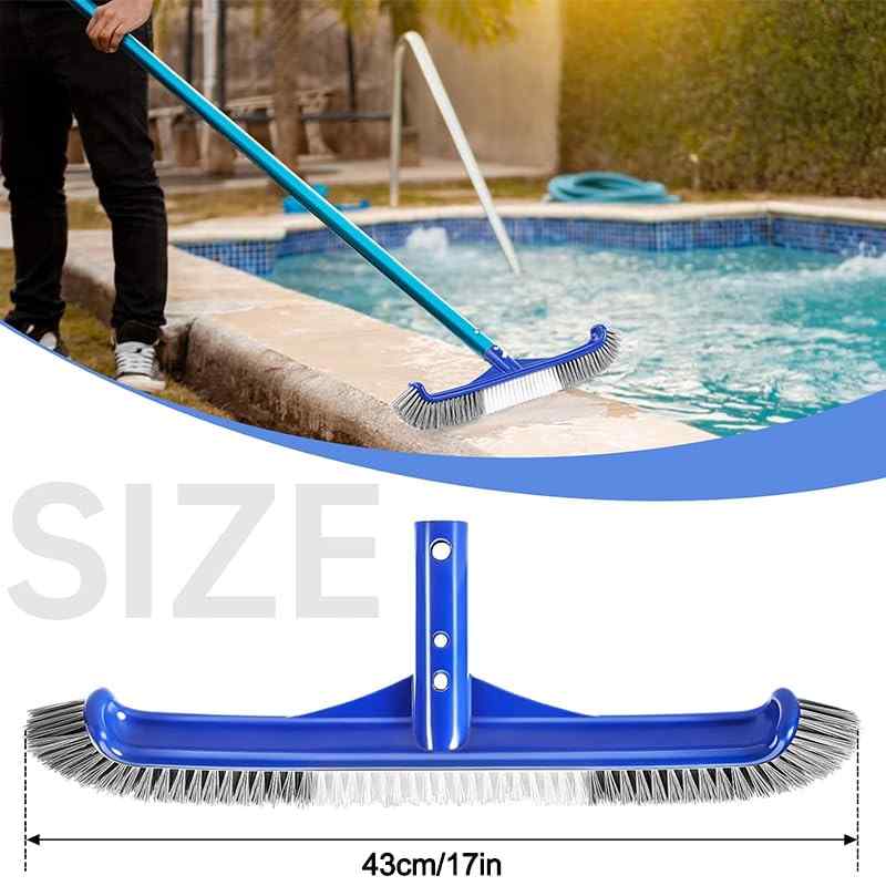 The Bush handle is angled at 45°for easy pushing and effective cleaning, help you save more energy. Measuring 17" wide, the Deluxe Wall Brush provides a large sweep area for quicker cleaning. Designed with curved edges and high-density poly bristles to help reach the toughest corners,metal backing provides enough strength to thoroughly clean pool walls and tiles.