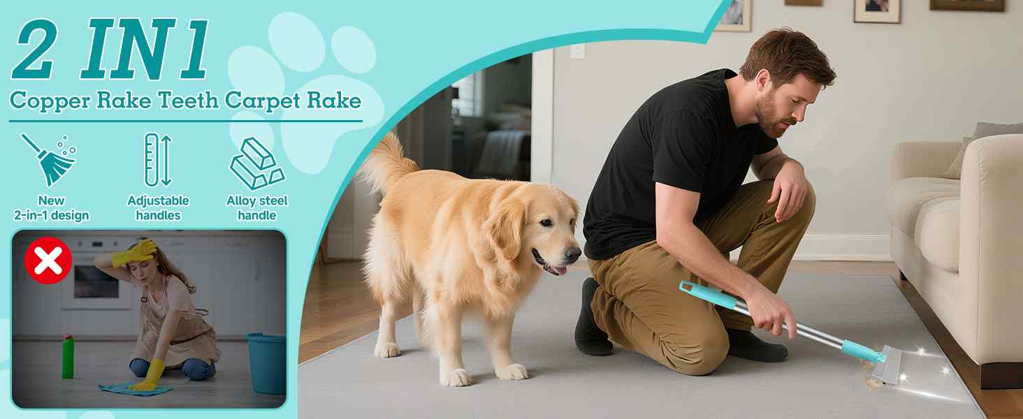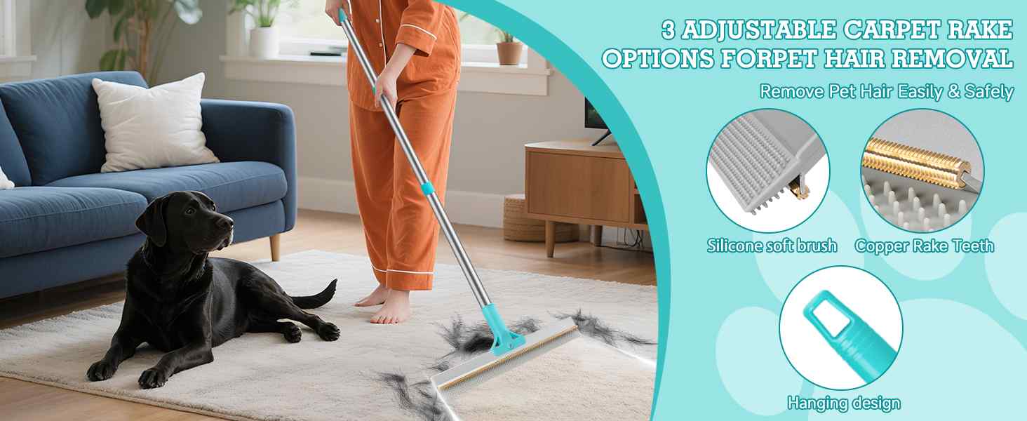 Reaches Where Vacuums Can't — Unlike surface-level vacuuming, our carpet rake penetrates deep into carpet fibers to lift stubborn, static-charged hair from medium to high-pile carpets, Berber carpets, and area rugs. Effectively removes embedded pet hair and allergens that regular cleaning methods leave behind, making it perfect for high-traffic zones where hair gets matted down.