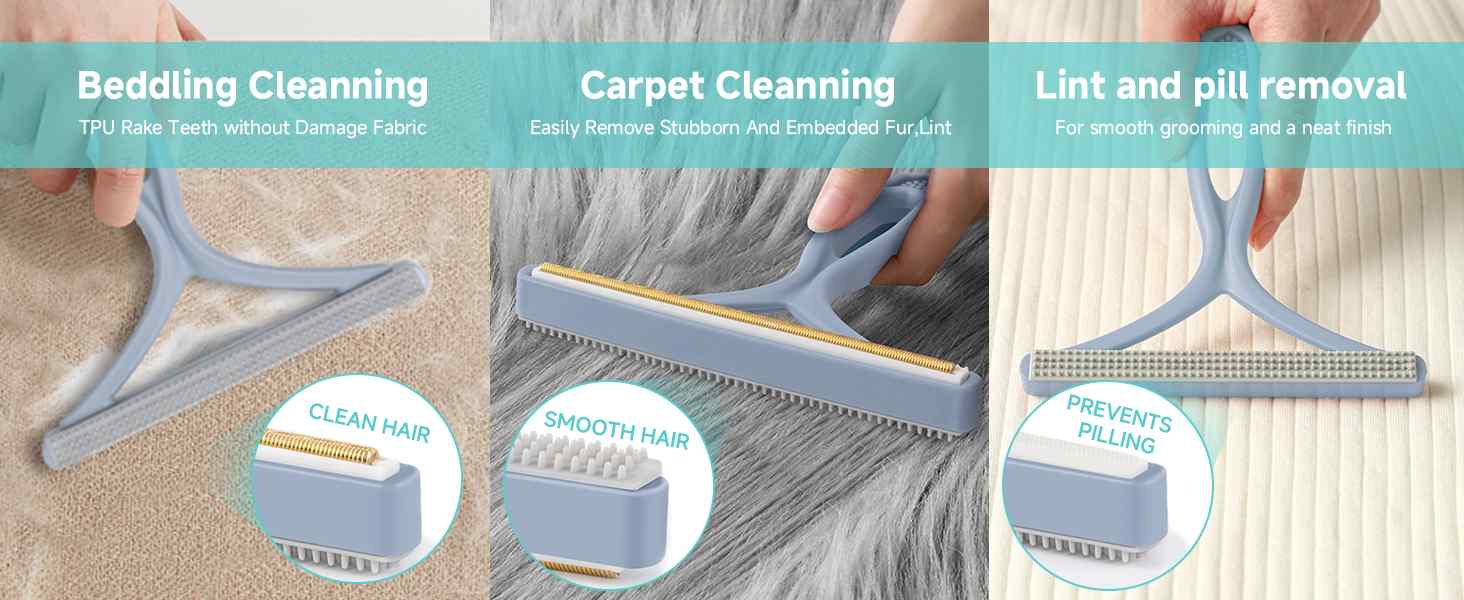 Multi-Surface Versatility — Complete kit includes a carpet rake for floors and 2 mini brushes for delicate surfaces. Safely works on synthetic carpets (nylon, polyester), natural fibers (with gentle pressure), upholstery, clothes, sofas, bedding, and car interiors. The gentle fabric-safe design protects scratch-prone surfaces while effectively removing hair and dander.