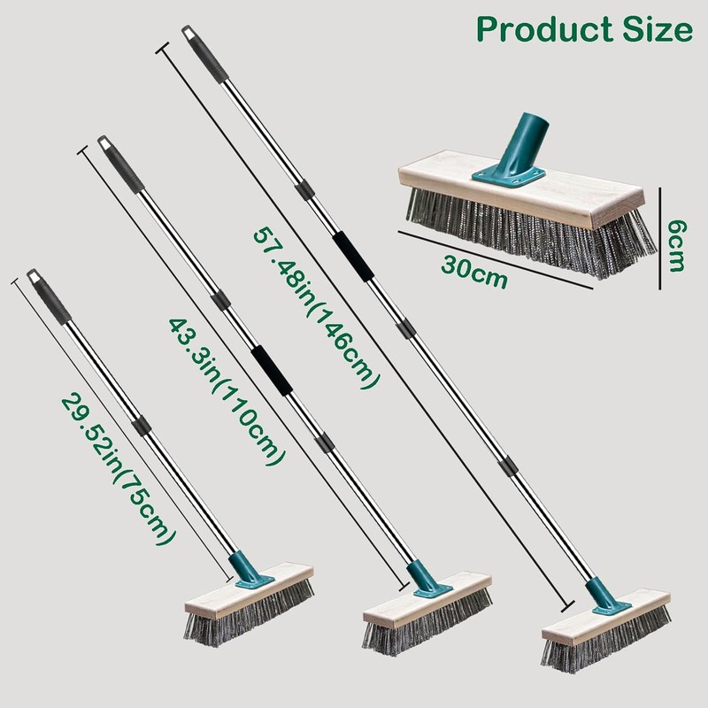 HEAVY DUTY WIRE BRUSH: The metal brush head is made of heavy-duty wire bristles that provide extra strength for removing stubborn stains from concrete, grout and other surfaces. Whether it's the edge of the pool or the outdoor floor, it can easily handle a wide range of stains.