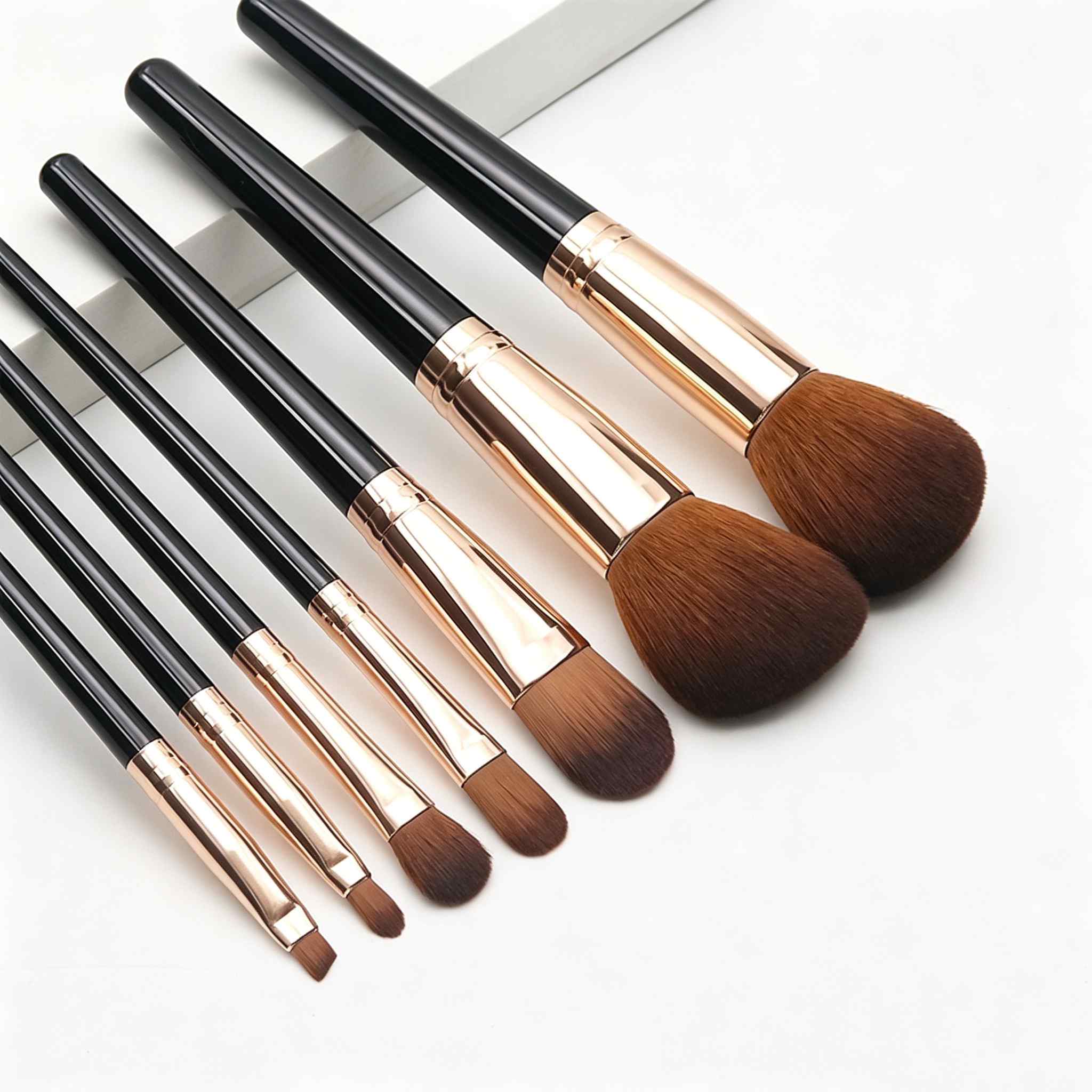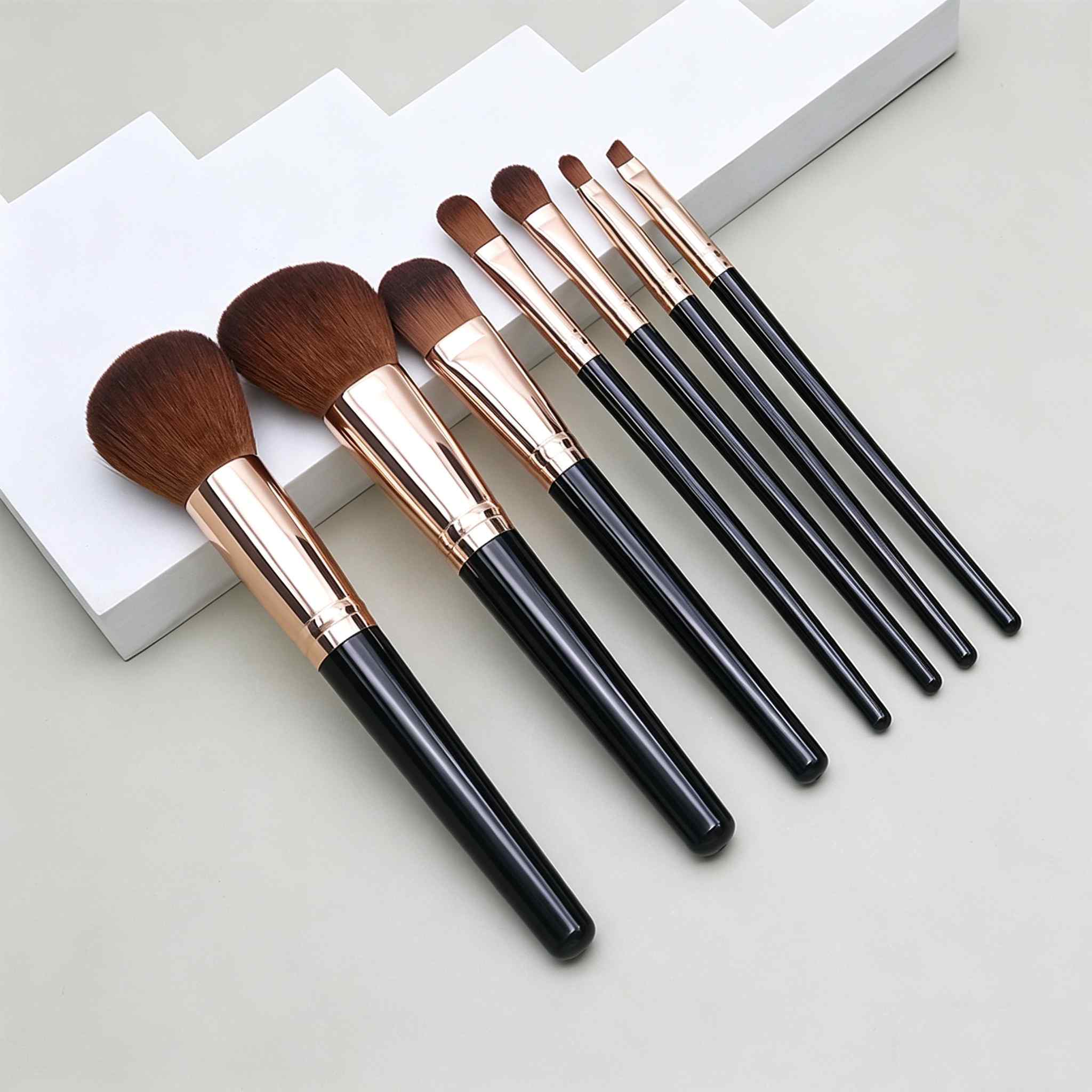 The luxe black handles paired with rose gold ferrules not only look elegant but also offer a comfortable, non-slip grip for precise control. Each brush is carefully shaped to suit its purpose: large powder brushes for even coverage, angled foundation brushes for seamless blending, and precision eyeshadow and liner brushes for detailed eye looks. The high-quality aluminum ferrules are built to hold bristles securely, preventing shedding even with frequent use and washing.